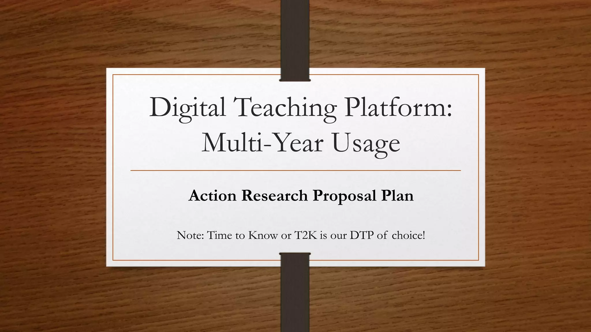 The document outlines a multi-year action research proposal plan for using the Time to Know (t2k) digital teaching platform at Shabach Christian Academy, focusing on assessing student achievement and attitudes in 4th and 5th grades. It examines the differences in achievement between first-year and second-year users of the platform, utilizing assessment tools aligned with Common Core standards to analyze outcomes. Preliminary findings indicate that both grades experienced achievement increases, with 4th graders showing higher performance and positive attitudes toward math and technology.
