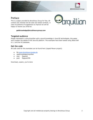 The document discusses different ways to configure and use Arquillian for integration testing Java EE applications. It covers creating test archives, configuring Arquillian, and different approaches for setting up test data like using SQL scripts, manually creating data, or importing from JSON/XML files. The key points are creating test archives with Maven or ShrinkWrap, configuring the Arquillian XML file and Maven dependencies, and using annotations to apply SQL scripts or import test data sets before tests run.