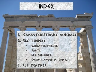 Espais per ala vida col·lectiva. Bellesa i perfecció. Mesura de l’ésser humà . Arquitravada : columnes verticals + bigues horitzontals. No hi havia arcs ni voltes. CARACTER Í STIQUES GENERALS