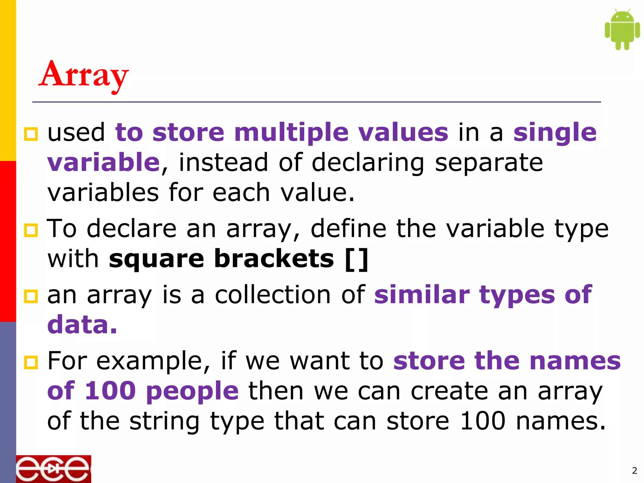 - Arrays are used to store multiple values of the same type in a single variable. There are single-dimensional and multi-dimensional arrays.