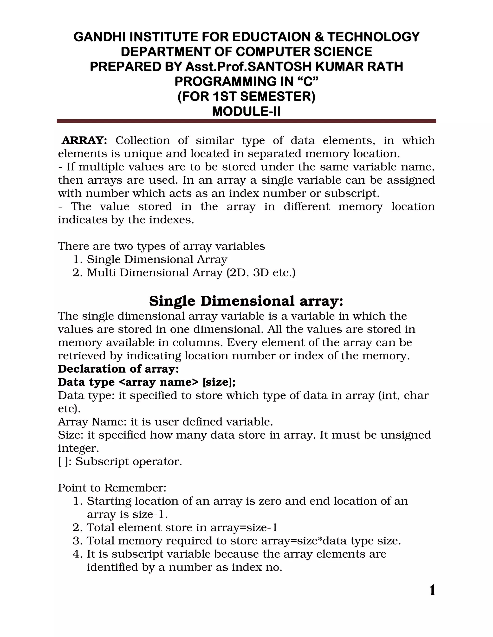 Arrays are collections of similar data elements stored in contiguous memory locations that can be individually accessed via an index. There are two types: single-dimensional arrays where elements are stored in one column, and multi-dimensional arrays where elements are stored in rows and columns. Arrays are declared with the data type, array name, and size, and elements are accessed using indexes that start at 0 up to size-1. Common array operations in C include inputting/outputting elements, finding sums/maximums, sorting, and performing operations on multi-dimensional arrays like matrix addition and multiplication.