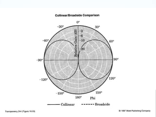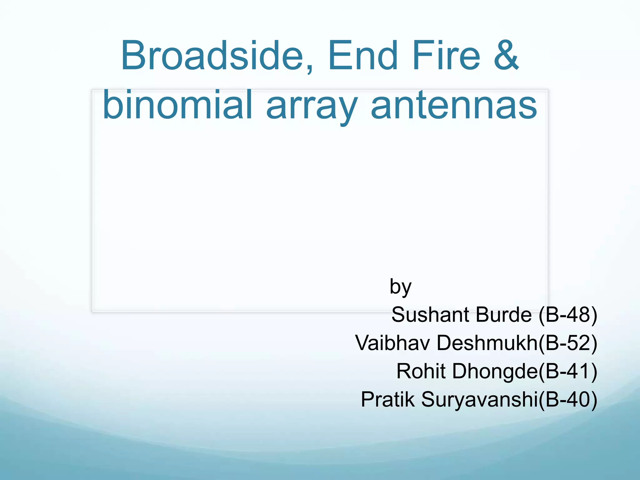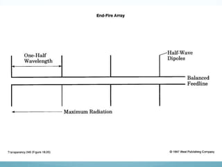 The document discusses different types of antenna arrays, including broadside arrays, end-fire arrays, and binomial arrays. A broadside array consists of half-wave dipoles spaced by half wavelengths that produces a highly directional radiation pattern perpendicular to the array. An end-fire array uses two half-wave dipoles spaced by half a wavelength and radiates in the plane of the dipoles. A binomial array arranges radiating sources according to binomial coefficients to reduce side lobes and optimize directivity.