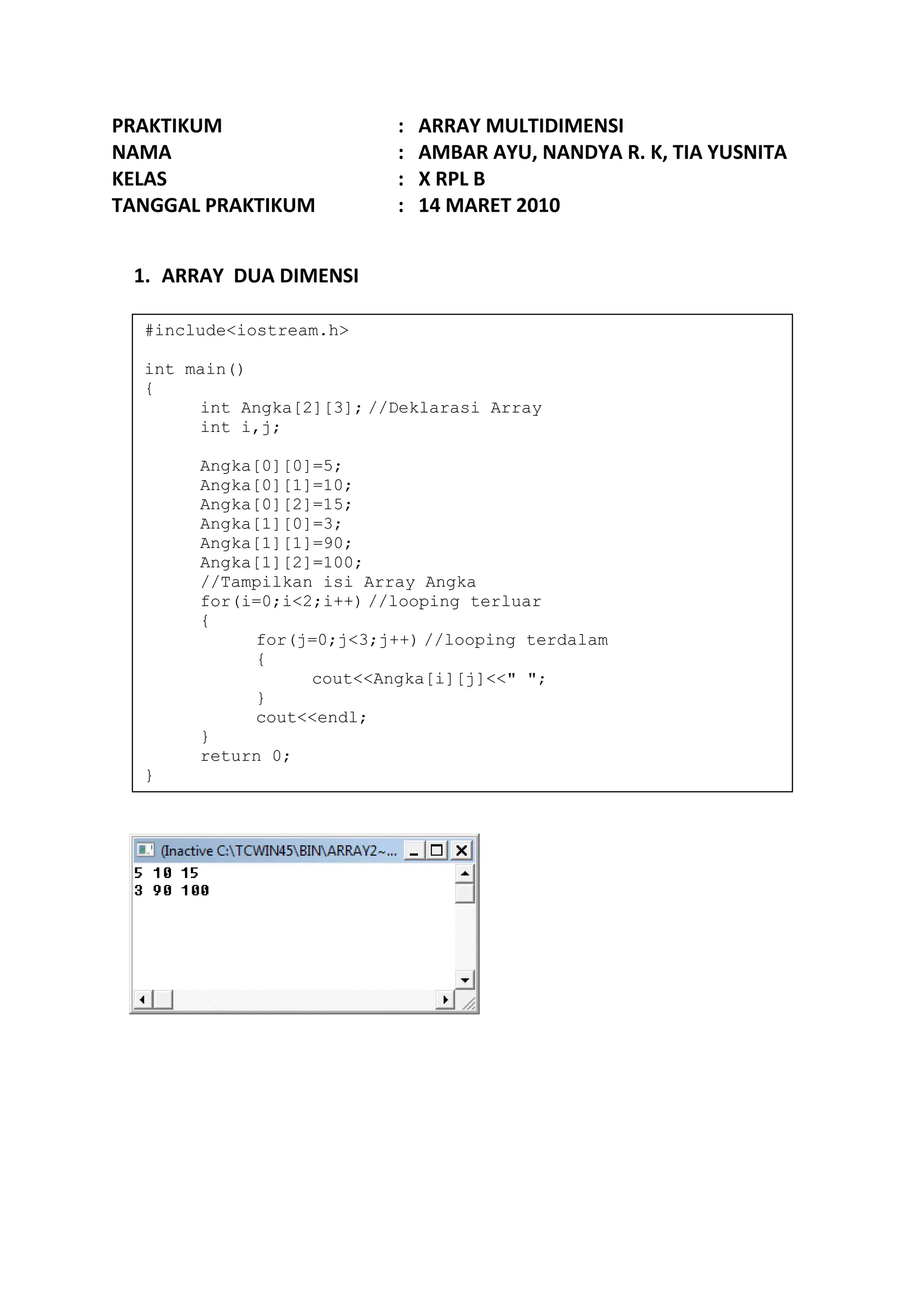 Dokumen tersebut berisi contoh-contoh penggunaan array multidimensi dalam bahasa C++ untuk menampilkan angka, huruf, dan operasi pembagian. Terdapat penjelasan tentang deklarasi array dua dimensi, inisialisasi nilai, looping untuk menampilkan isi array, dan kesimpulan bahwa array multidimensi dapat menyimpan nilai berbeda pada setiap baris dan kolomnya.