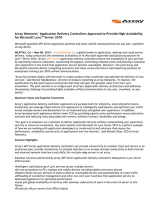 Array Networks has announced the availability of its Microsoft-approved application delivery controllers to enhance the high availability of Microsoft Lync Server 2010. The APV series appliances optimize the performance and scalability of Lync services across various devices while ensuring a seamless user experience and lower total cost of ownership. This collaboration aims to provide enterprises with reliable and efficient communication solutions that meet modern demands.