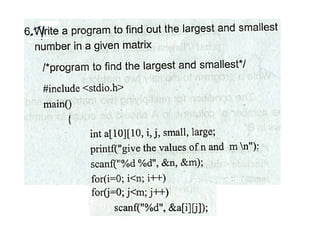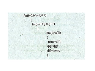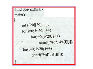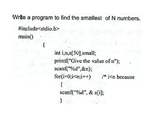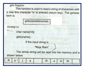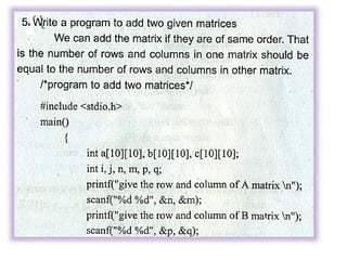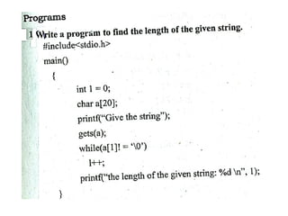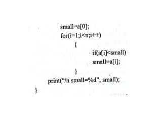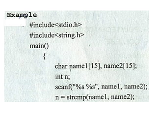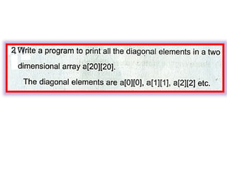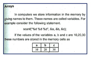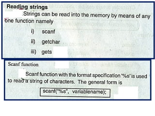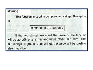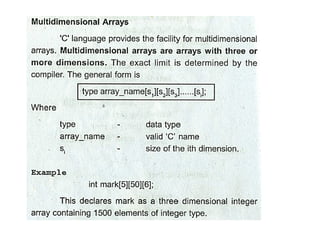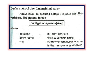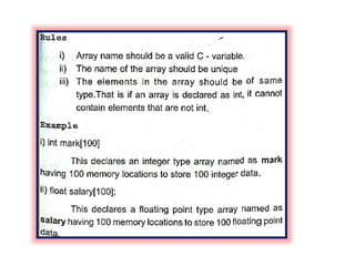 array unit 1 and strings Array: A collection of similar data elements stored in consecutive memory locations. Arrays can be one-dimensional (1D) or multi-dimensional (2D/3D) and support operations like traversal, insertion, deletion, searching, and sorting. String: A sequence of characters ending with a null character (\0), stored as a character array. Common string functions include strlen(), strcpy(), strcat(), and strcmp() from <string.h>. Arrays store numbers or characters, while strings specifically handle text data using character arrays. Array: A collection of similar data elements stored in consecutive memory locations. Arrays can be one-dimensional (1D) or multi-dimensional (2D/3D) and support operations like traversal, insertion, deletion, searching, and sorting. String: A sequence of characters ending with a null character (\0), stored as a character array. Common string functions include strlen(), strcpy(), strcat(), and strcmp() from <string.h>. Arrays store numbers or characters, while strings specifically handle text data using character arrays. Array: A collection of similar data elements stored in consecutive memory locations. Arrays can be one-dimensional (1D) or multi-dimensional (2D/3D) and support operations like traversal, insertion, deletion, searching, and sorting. String: A sequence of characters ending with a null character (\0), stored as a character array. Common string functions include strlen(), strcpy(), strcat(), and strcmp() from <string.h>. Arrays store numbers or characters, while strings specifically handle text data using character arrays.Array: A collection of similar data elements stored in consecutive memory locations. Arrays can be one-dimensional (1D) or multi-dimensional (2D/3D) and support operations like traversal, insertion, deletion, searching, and sorting. String: A sequence of characters ending with a null character (\0), stored as a character array. Common string functions include strlen(), strcpy(), strcat(), and strcmp() from <string.h>. Arrays store numbers or characters, while strings specifically handle text data using character arrays. Array: A collection of similar data elements stored in consecutive memory locations. Arrays can be one-dimensional (1D) or multi-dimensional (2D/3D) and support operations like traversal, insertion, deletion, searching, and sorting. String: A sequence of characters ending with a null character (\0), stored as a character array. Common string functions include strlen(), strcpy(), strcat(), and strcmp() from <string.h>. Arrays store numbers or characters, while strings specifically handle text data using character arrays.Array: A collection of similar data elements stored in consecutive memory locations. Arrays can be one-dimensional (1D) or multi-dimensional (2D/3D) and support operations like traversal, insertion, deletion, searching, and sorting. String: A sequence of characters ending with a null character (\0), stored
