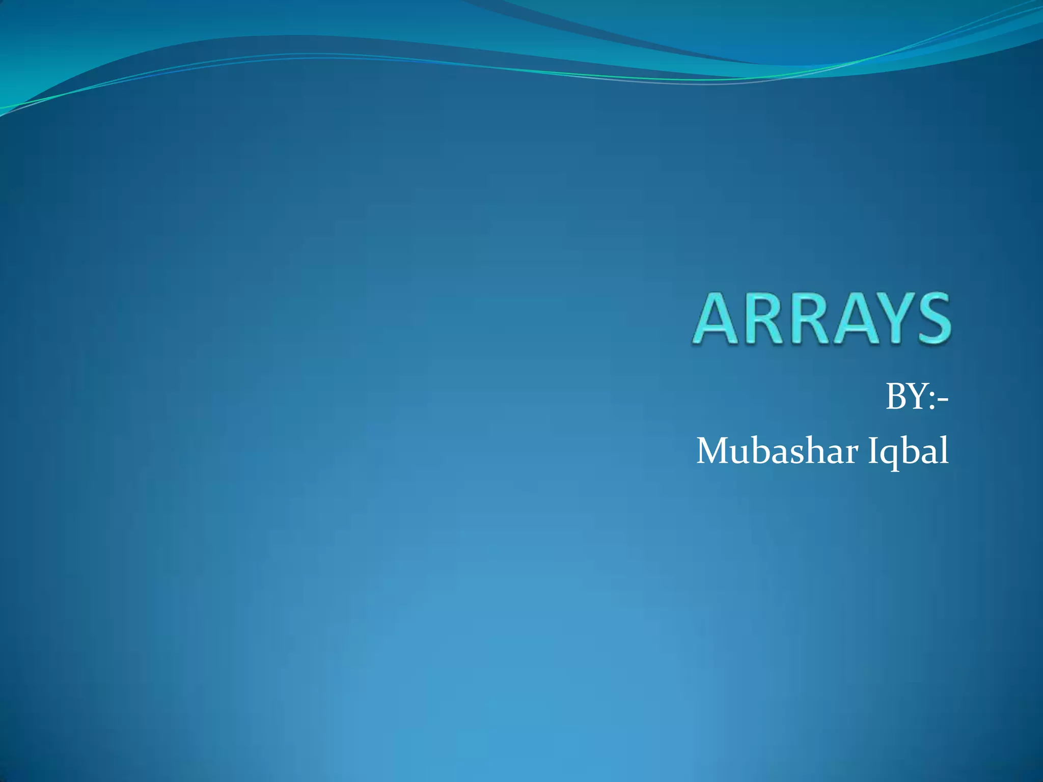 This document outlines the key concepts of arrays including: - Arrays are a derived data type that store a collection of elements of the same type. - Arrays can be one-dimensional, two-dimensional, or multi-dimensional. Memory is allocated contiguously for an array. - Arrays can be declared and initialized, and passed to functions by reference. - Arrays resemble pointers as they store addresses, but are not the same as pointers. - Operations like sorting, deleting elements, and traversing arrays allows them to be used to solve problems involving matrices, sets, and storing large data sets.