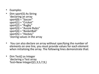 Arrays allow storing and accessing multiple data elements using numeric indices. Arrays can be one-dimensional or multidimensional. One-dimensional arrays are linear arrays while multidimensional arrays include jagged arrays where each sub-array can have a different length. Arrays are declared using keywords like Dim and can be reinitialized using ReDim which resizes the array. Control structures like If/Then, Do/Loop, and For/Next are used to control program flow.