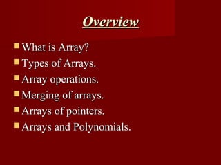 The document discusses arrays in data structures using C programming language. It defines what an array is and describes different types of arrays like one-dimensional, two-dimensional, and multi-dimensional arrays. It also explains array operations such as insertion, deletion, traversal, reversing, sorting, and searching. Additionally, it covers merging of arrays, arrays of pointers, and using arrays to represent polynomials.
