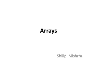 The document provides a comprehensive overview of arrays, detailing their classification into one-dimensional and two-dimensional types, and outlining their declaration, access, memory allocation, and operations like insertion, deletion, and merging. It emphasizes the necessity of arrays for managing large datasets efficiently and discusses the calculations of address and length of array elements. The document includes various code examples demonstrating the initialization and manipulation of arrays in programming.
