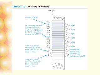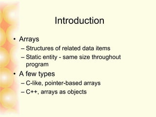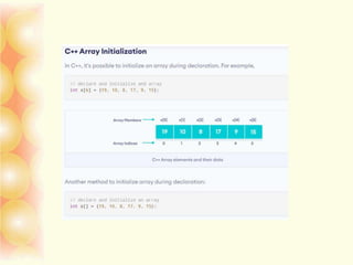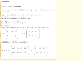 The document provides a detailed overview of arrays and matrices in C++, covering topics such as array declaration, initialization, accessing elements, and examples of functionalities like array summation and finding minimum values. It includes code snippets demonstrating various operations with arrays, including multi-dimensional arrays and functions that utilize arrays as parameters. Additionally, the document explains concepts related to memory layout and implicit sizing of arrays.