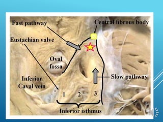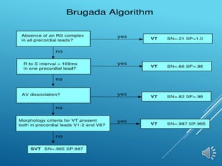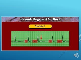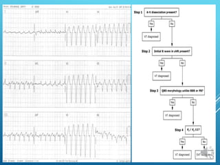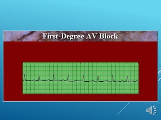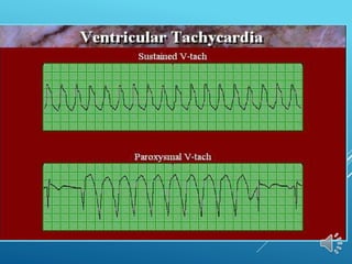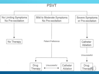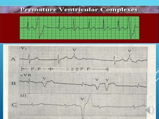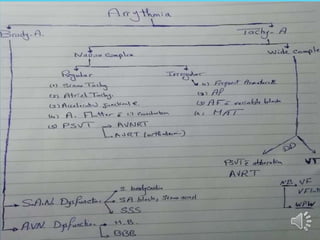 This document discusses different types of arrhythmias including their definitions, causes, symptoms, and treatments. It describes normal sinus rhythm and sinus arrhythmias like sinus tachycardia, bradycardia, arrest, and sick sinus syndrome. It also covers atrial arrhythmias including premature contractions and atrial fibrillation. Diagnosis involves analyzing the electrocardiogram to determine heart rate, rhythm, P wave presence, and PR/QRS intervals. Potential treatments include managing underlying causes, stopping unstable rhythms, and pacemaker implantation.