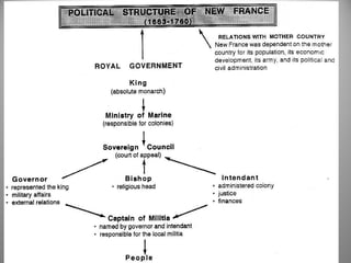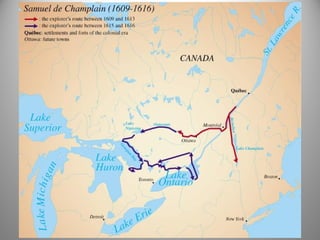 The French explored North America beginning in 1524 seeking the Northwest Passage to Asia. Jacques Cartier explored the St. Lawrence River and claimed the land for France. Attempts to establish colonies failed due to harsh winters. The fur trade became important as Europeans traded goods for furs from Native peoples. Samuel de Champlain founded Quebec City in 1608 and formed an alliance with the Huron people, expanding French imperial interests in the region. New France was established as a royal colony in 1663, governed by an intendant, governor, and bishop to represent French interests in the new territory.