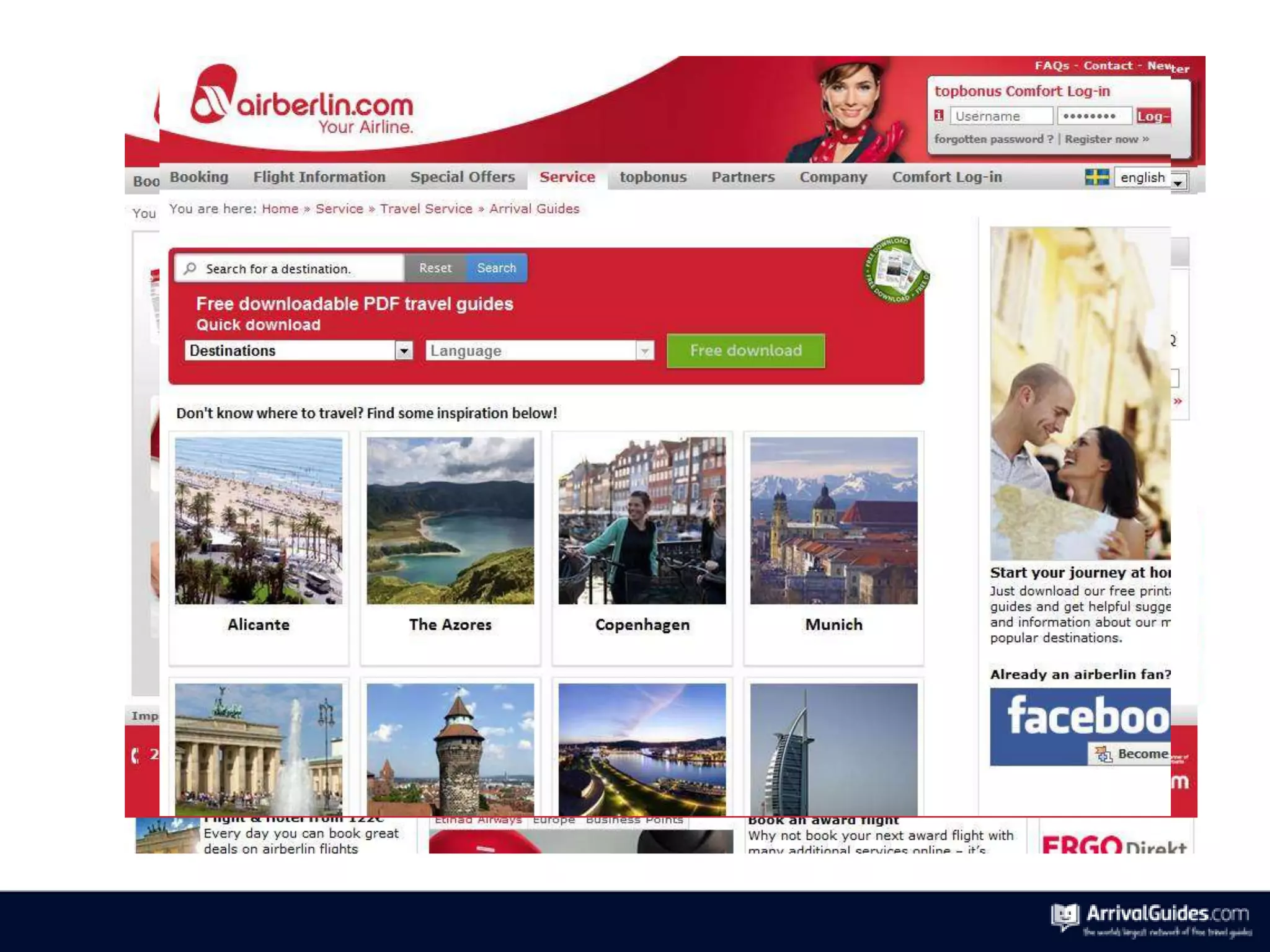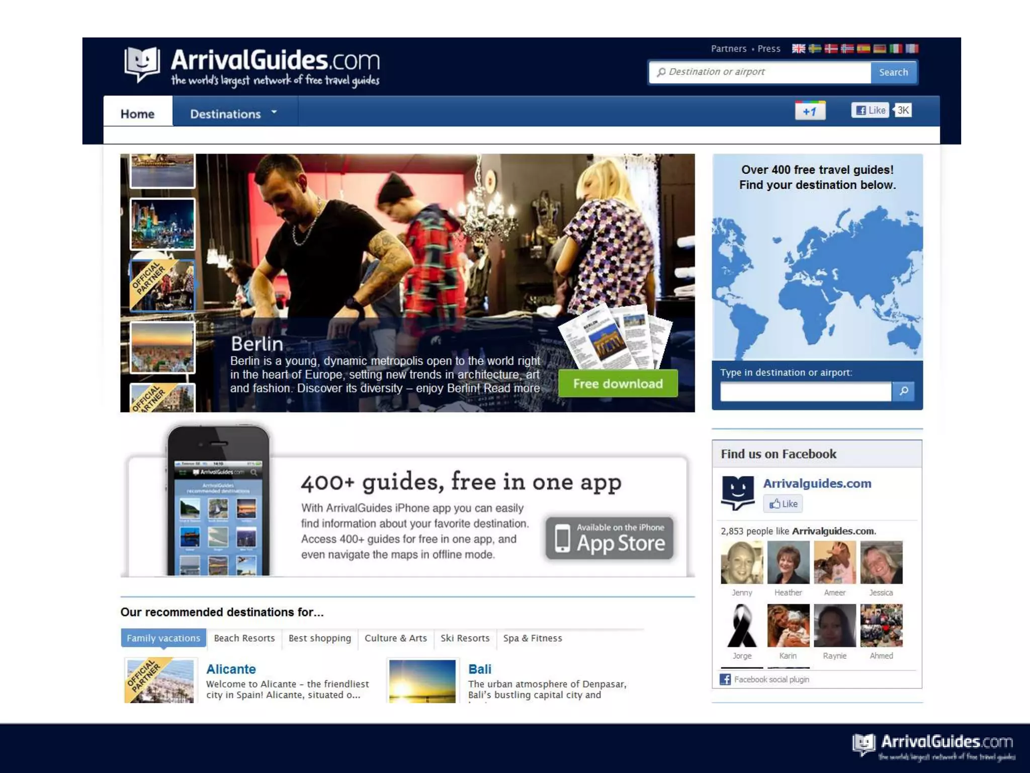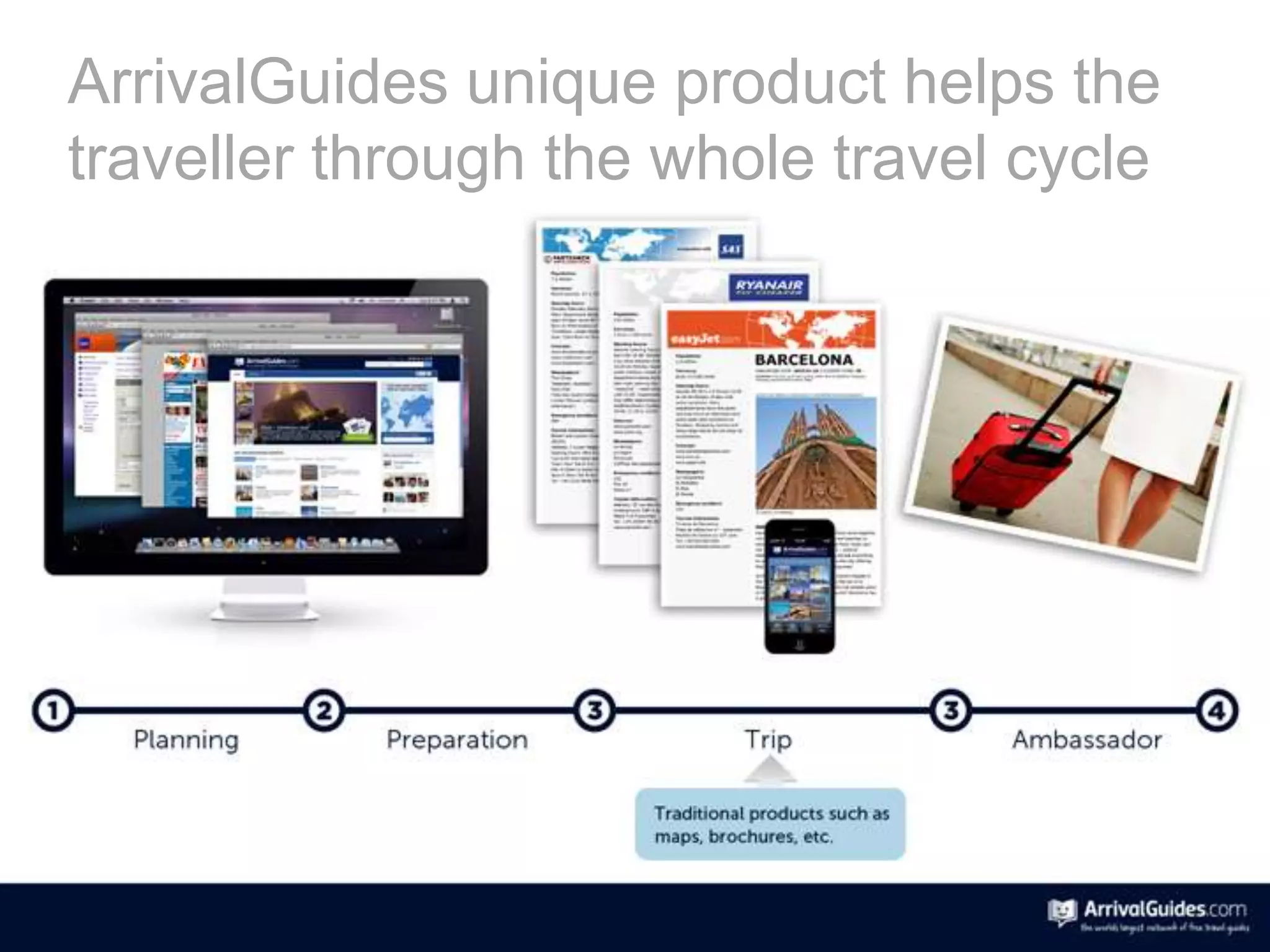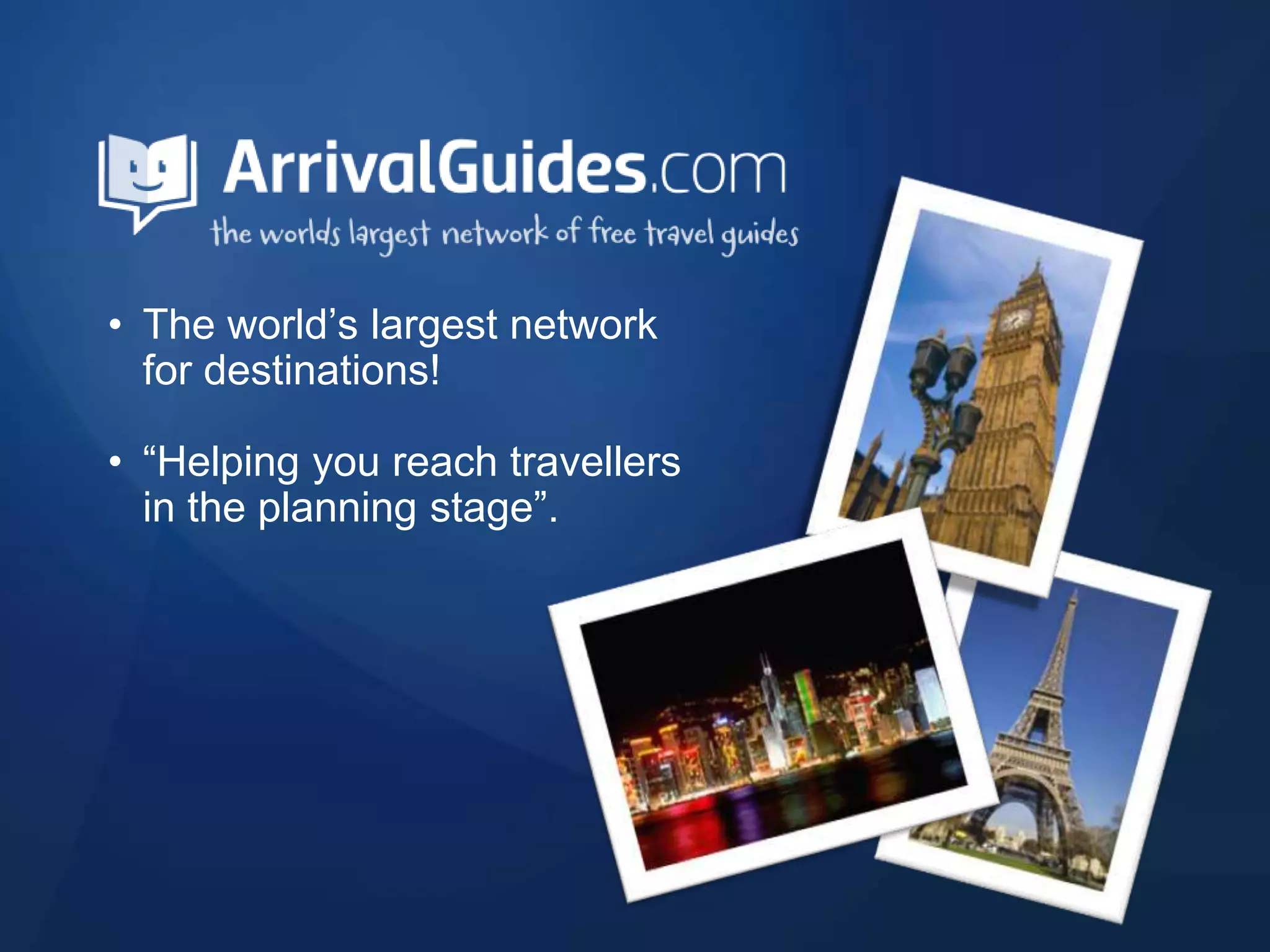 ArrivalGuides is the world's largest travel operator network with over 170 distribution partners, including 40 international airlines, reaching more than 500 million travelers annually. The service assists travelers throughout their journey, leveraging a comprehensive database and support from local tourist organizations. Its extensive network spans numerous global destinations, enhancing travel planning for customers.
