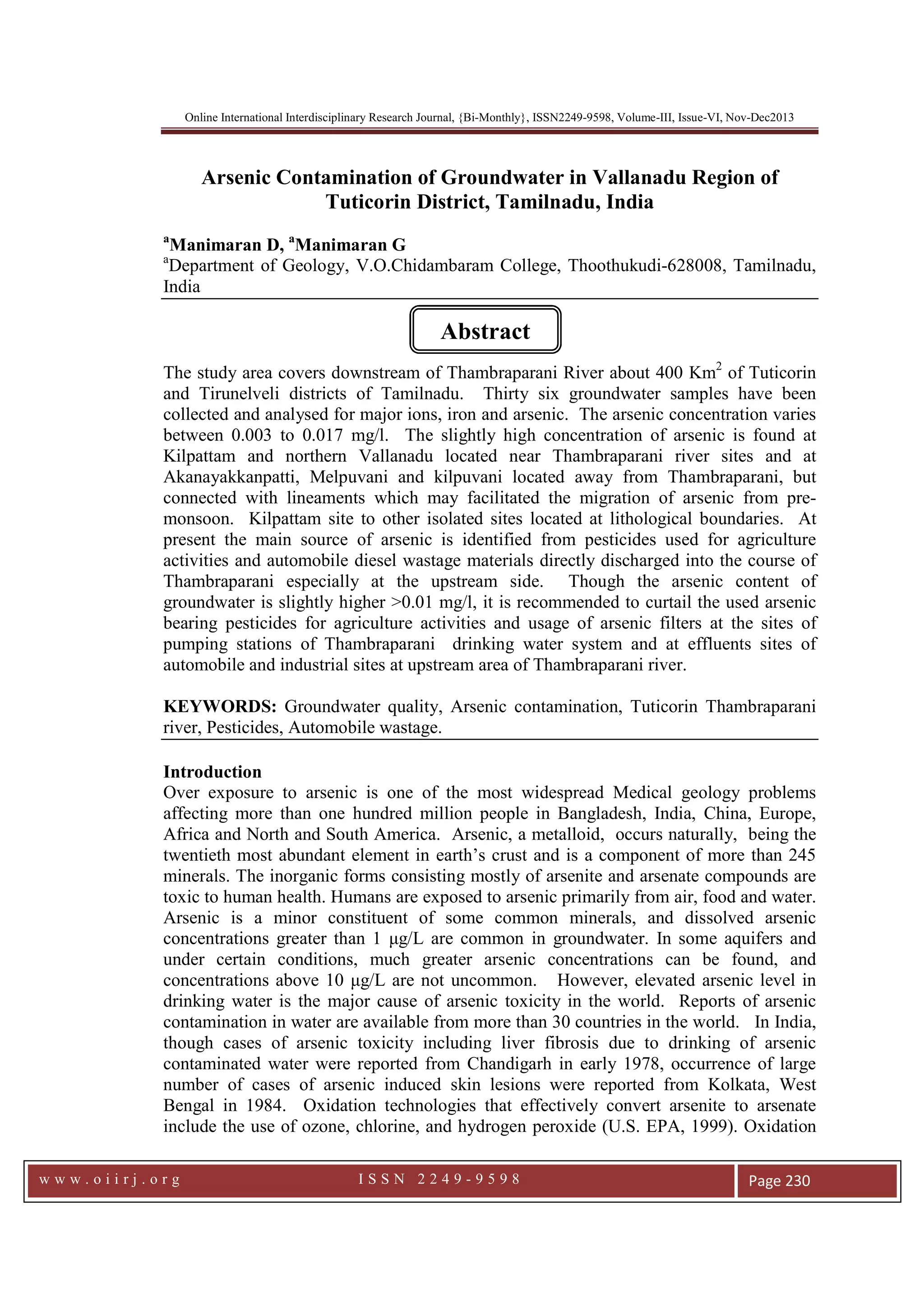 This document summarizes a study of arsenic contamination in groundwater in the Vallanadu region of Tamil Nadu, India. Thirty-six groundwater samples were collected and analyzed for arsenic and other parameters. Arsenic concentrations ranged from 0.003 to 0.017 mg/L, with slightly higher levels found near the Thambraparani River and along geological lineaments. The main sources of arsenic were identified as pesticides used in agriculture and waste from automobiles discharged into the river. Though most samples met standards, concentrations above 0.01 mg/L were found in some locations. The study recommends reducing arsenic-containing pesticides and installing filters to address contamination issues.
