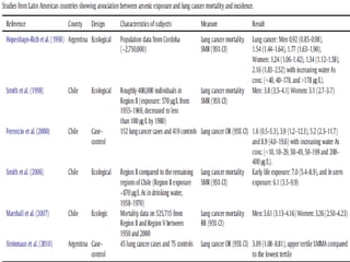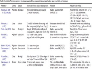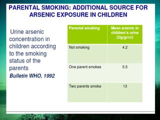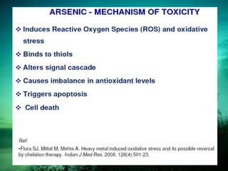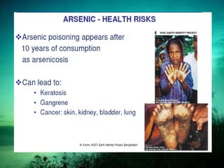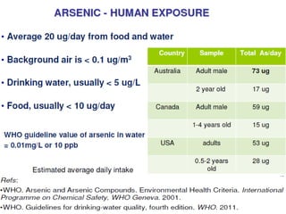 This document discusses arsenic poisoning. It begins by defining arsenic and describing its characteristics, including that it is colorless, odorless, and tasteless. It then discusses sources of arsenic exposure like contaminated water or food, occupational exposure, and arsenic's movement in the environment. The document outlines both acute and chronic health effects of arsenic poisoning, including cancers, neurological effects, and vascular disease. It provides details on treatment options like chelation therapy and hemodialysis. In the end, it discusses some case studies on arsenic exposure in Latin America and links between high exposure levels and various adverse health outcomes.