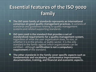 The ISO 9000 family of standards provides a framework for quality management systems. ISO 9001:2008 is the key standard that specifies requirements for a quality management system that can be certified. It requires organizations to systematically manage their processes to consistently meet customer expectations. The standard is flexible and can be implemented across diverse organizations. Organizations are required to audit their own quality systems and may choose to have independent certification audits to verify compliance, which can help gain clients' confidence and reduce redundant audits.