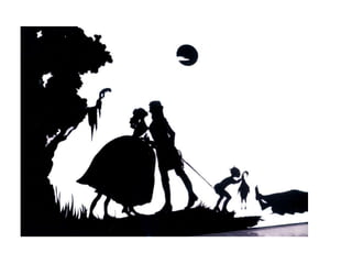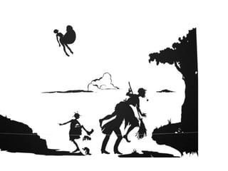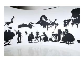 Kara Walker is a contemporary artist who teaches at Columbia University. She was born in California but grew up in Georgia. Walker focuses her work on historical narratives represented through art in the form of stories. The art of silhouette originated in Europe in the 1700s as entertainment for royalty. It grew out of fashion as a way to capture profiles and styles. Though the aristocracy enjoyed luxuries, much of Europe starved, which led to the downfall of Etienne de Silhouette, whose tax policies crippled France while he enjoyed silhouette cutting as a hobby.