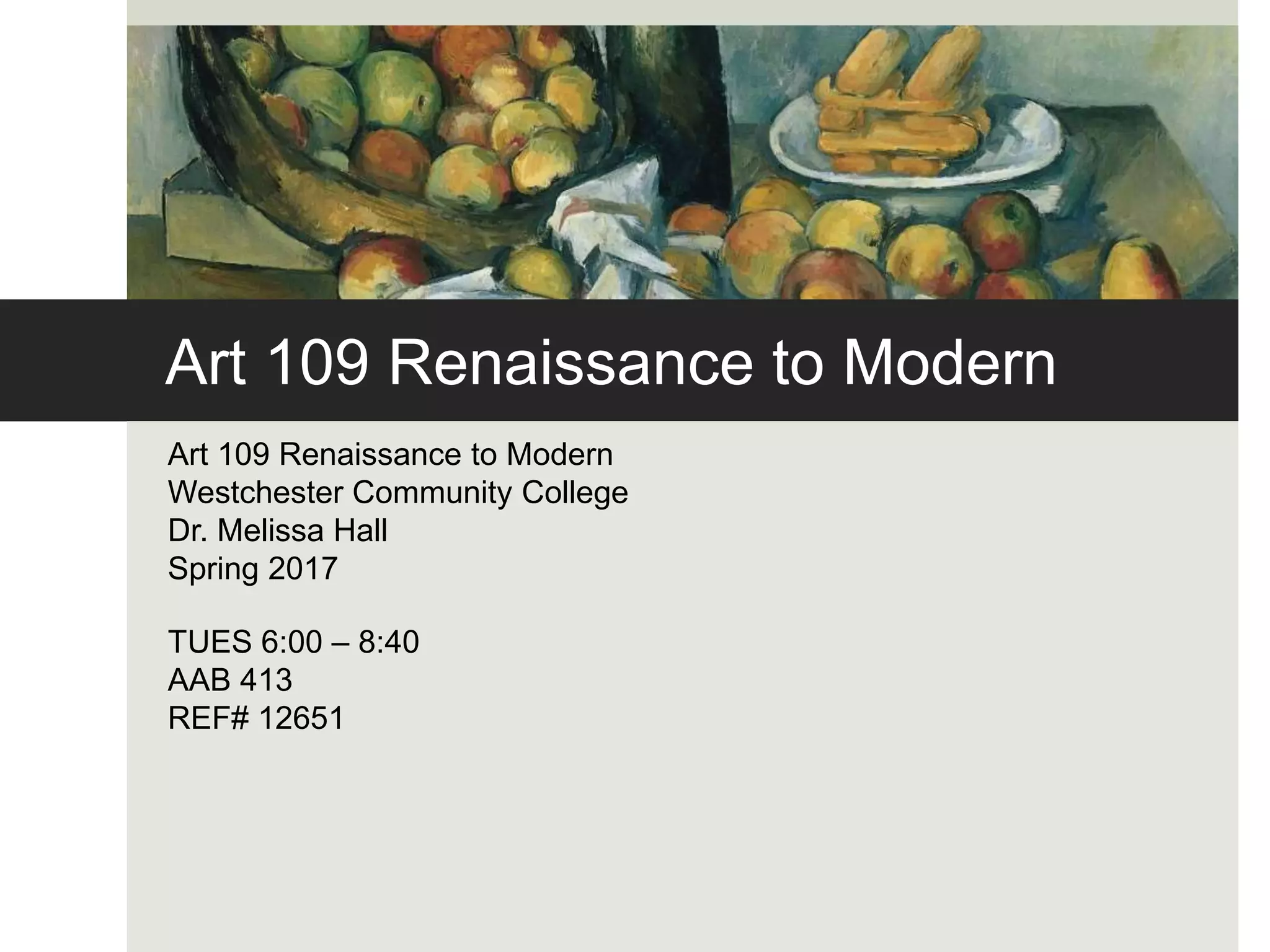 This document provides an overview of the Art 109 Renaissance to Modern course being taught at Westchester Community College during the Spring 2017 semester. It outlines the course description, learning objectives, assignments including homework, quizzes, essays and exams. Assessment criteria, policies on late submissions, attendance, academic honesty and available student support services are also summarized. The course is taught by Professor Melissa Hall and will cover major Western art movements and artists from the 14th to 20th centuries through an online textbook and in-person lectures on Tuesdays from 6-8:40pm in room AAB 413.