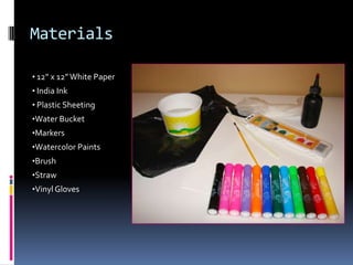 1. Use india ink and a straw to blow ink drops on paper to create trees, filling the page with at least 10 trees.