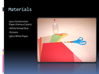 This document provides instructions for making a Native American blanket out of construction paper. It involves cutting paper into 2-inch strips in various colors and gluing them down in a pattern on a white background paper. Lines are then cut out of strips opposite in color and glued over the strips. Shapes are added using the color underneath the lines to complete the blanket design.