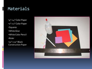 The document provides instructions for making an origami flower craft out of colored paper squares. It involves the following steps: