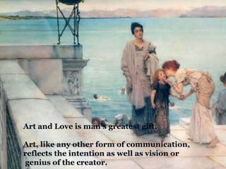 Art and Love is man’s greatest gift. Art, like any other form of communication,  reflects the intention as well as vision or genius of the creator.