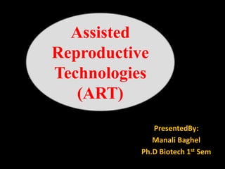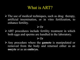 ART involves medical techniques like drug therapy, artificial insemination, and IVF to treat infertility. Key ART procedures include IUI, IVF, ICSI, and surrogacy. The first successful human IVF resulted in Louise Brown's birth in 1978. While ART has helped many conceive, it also presents risks like multiple births, infection, and complications for mother and baby. Ongoing research aims to improve outcomes and access to these important infertility treatments.