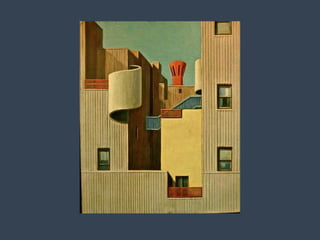 Visual artists portray their environments from their own perspectives by deciding what to include or leave out when capturing the natural elements, man-made structures, and sensory experiences that make up a place. They represent more than just the visual by recording how the environment makes them feel through its sights, sounds, smells, and their interactions. The document provides examples of famous artists like Ansel Adams, Winslow Homer, and Georgia O'Keeffe who have depicted natural and urban environments through wide landscapes, architecture, foliage, and more.