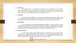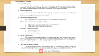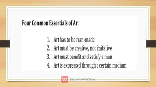 This document provides information about an Art Appreciation course for general education. The 3-unit course explores visual art forms and develops students' cultural understanding and analytical skills. It covers art history, elements, and creative processes. Students will learn a 5-step system to understand art based on description, analysis, context, meaning, and judgment. The course outline and outcomes focus on communication, art elements, processes, analytical skills, and locating/evaluating information about visual art.