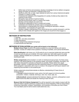 This document provides an overview of an Art Appreciation course at Palm Beach State College, including information about the professor, required text, course description, student learning outcomes, methods of instruction and evaluation, grading procedures, class policies, and expectations. The course is a global survey of art history from early civilizations to contemporary art, examining the social contexts and roles of art. Students will develop skills in formal analysis, critical thinking, and written assignments to demonstrate their understanding of art in different cultures and time periods.