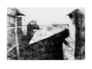 The document discusses the history and evolution of photography from its origins with the camera obscura to its establishment as an artistic medium. It covers influential early photographers like Niepce, Daguerre, and Talbot, as well as the development of techniques like the daguerreotype and salt print. The document also explores how photography was used for portraiture and social documentation and change, and how color photography eventually gained acceptance as a legitimate art form.