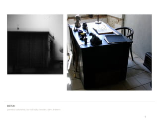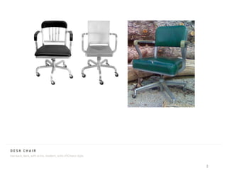 The document provides details on furniture and accessories with a masculine, modern, and functional style. It describes a dark wooden desk with drawers, a low-back dark desk chair with arms in an Emeco style, a simple black hanging lamp with sharp angles, a thick black or stainless steel coffee mug with an angled handle, a small stainless flask with a black leather wrap, a medium-height heavy steel file cabinet in a Steelcase style, a pill-shaped pivoting microphone in neutral colors, manila or craft paper loop tie envelopes ideally with red loops, and suggests burly blinds, file cabinets, chairs, and lamps for an interrogation room with heavy window slats, retrofitted conduit, two-