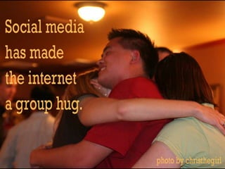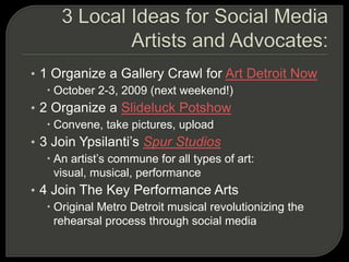 3. The presentation examines case studies on how social media has influenced visual art, writing, and social change movements through increased accessibility, accountability and transparency.