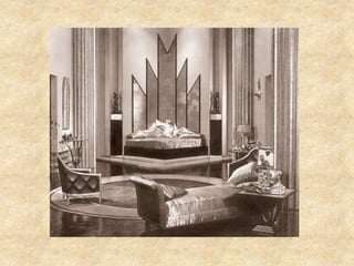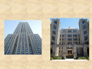 Art Deco was an influential design style that emerged after World War I, characterized by geometric shapes, bold colors, and lavish ornamentation. It represented luxury, modernism, and faith in social and technological progress. Many buildings from the 1930s-1940s have an Art Deco exterior with symmetrical designs, distinctive windows and colors. Identifying characteristics of Art Deco architecture include rounded corners, horizontal banding, columns, glass blocks, and zigzag or stepped designs. Materials often included stucco, concrete, stone, and terra cotta. Windows were usually arranged in continuous horizontal bands. Prominent Art Deco buildings included the Chrysler Building, Empire State Building, and Radio City Music Hall.