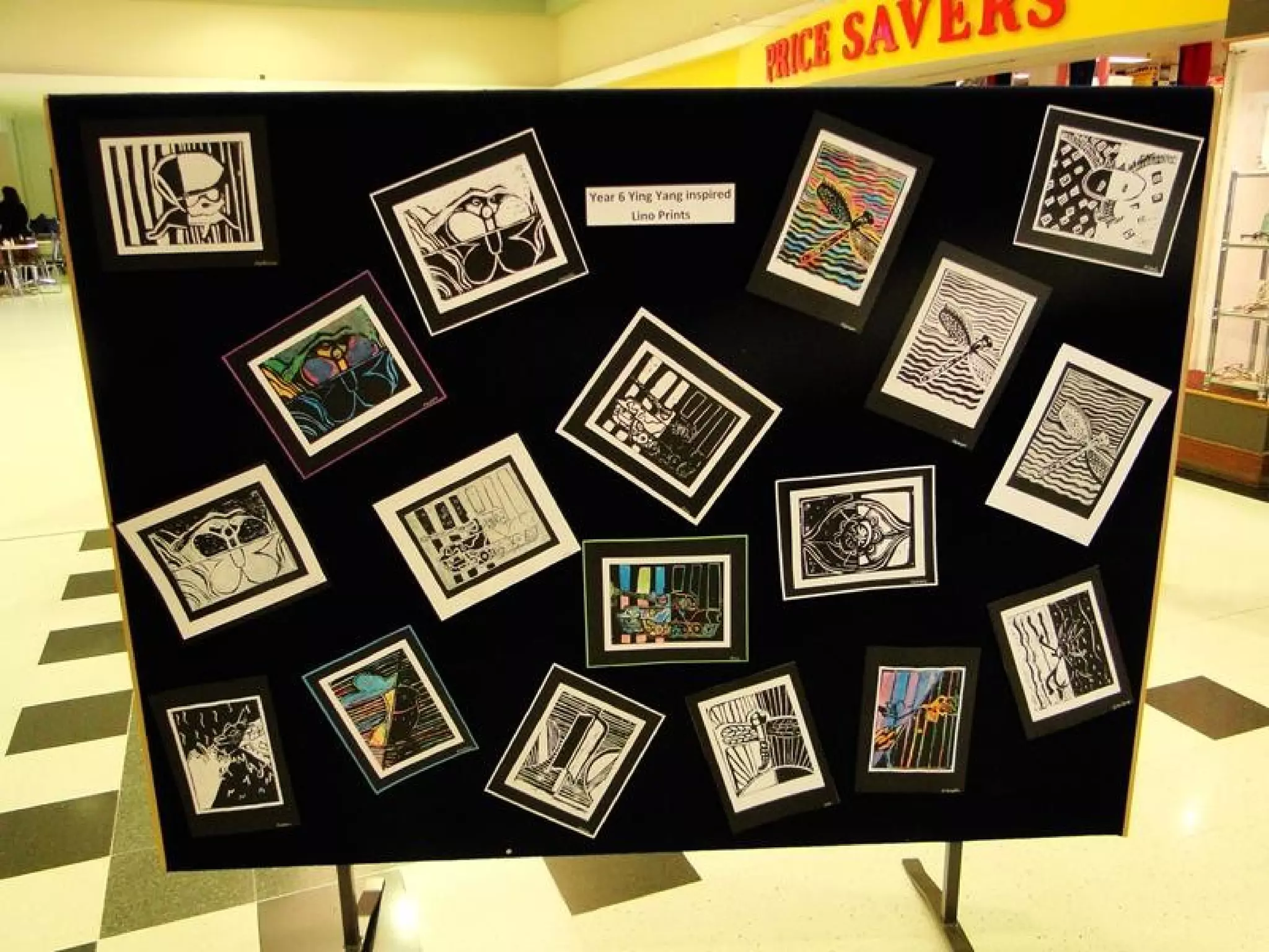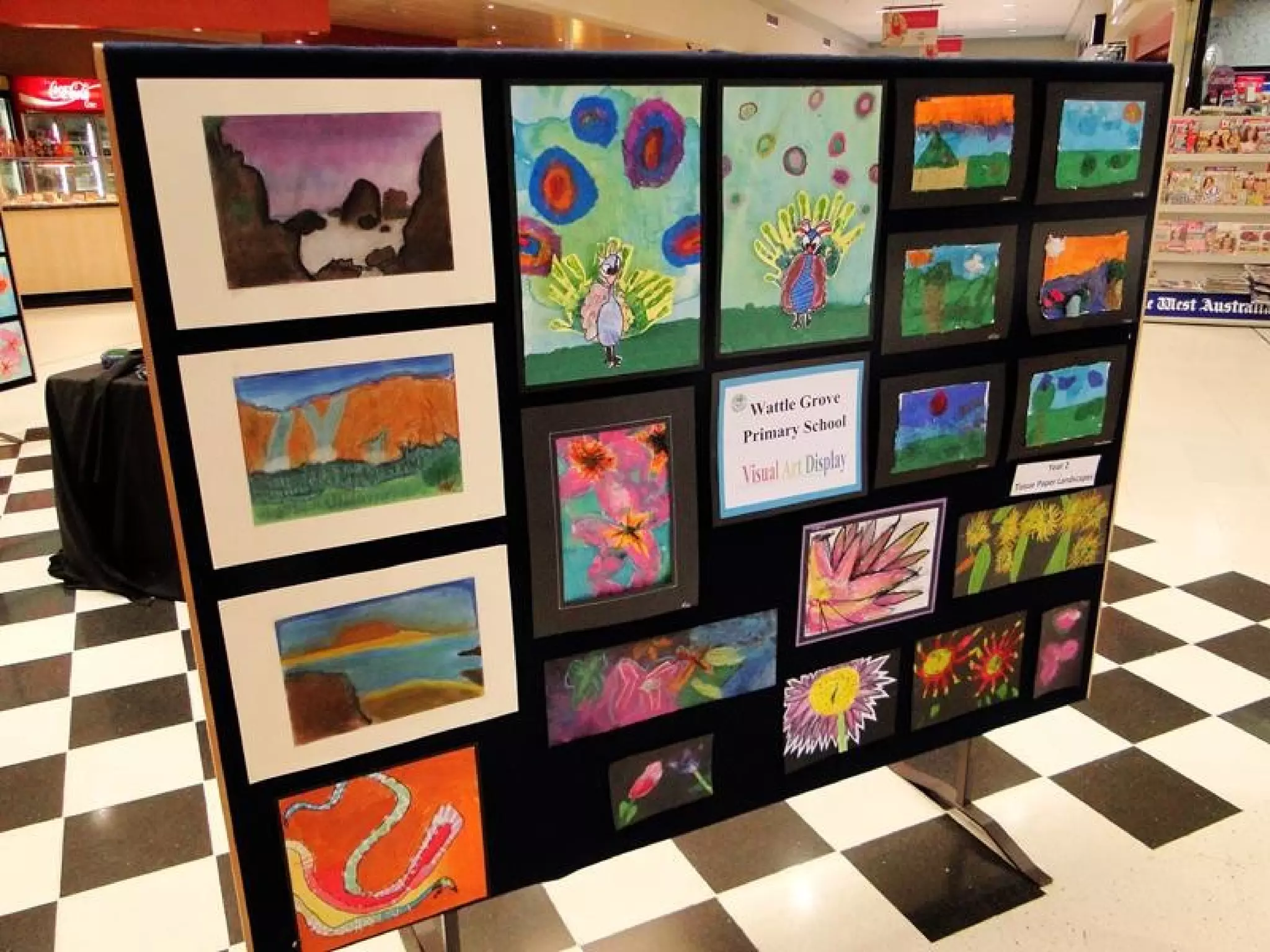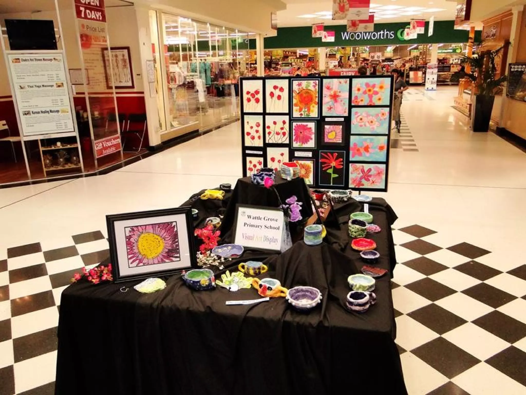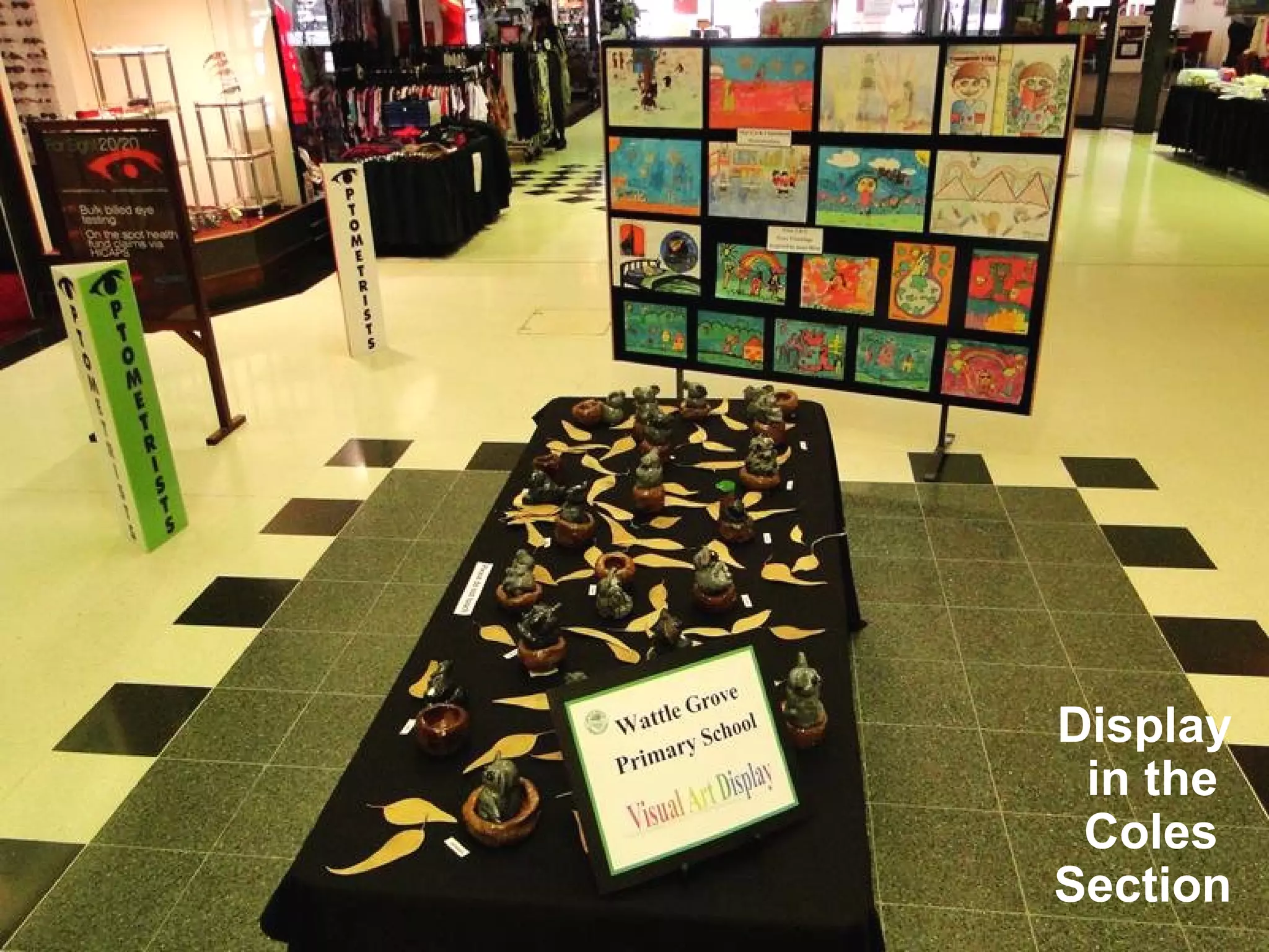 Wattle Grove Primary School showcased artworks at Forrestfield Shopping Centre during the Term 3 break in 2013. The display was set up in both the Coles and Woolworths sections. Congratulations were extended to Ms. Larkin and the art students for their achievement.