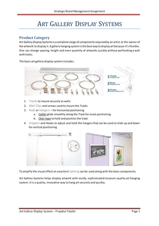 The document discusses art gallery display systems and leading brands in the industry. It provides details about the basic components of an art gallery display system including tracks, wall clips, rods or hangers, grippers and hooks. It then profiles three leading brands - Gallery System Art Displays, AS Hanging Display Systems, and STAS Picture Hanging Systems - and discusses their product lines, roles they serve for consumers, and reasons for their leadership in the industry.
