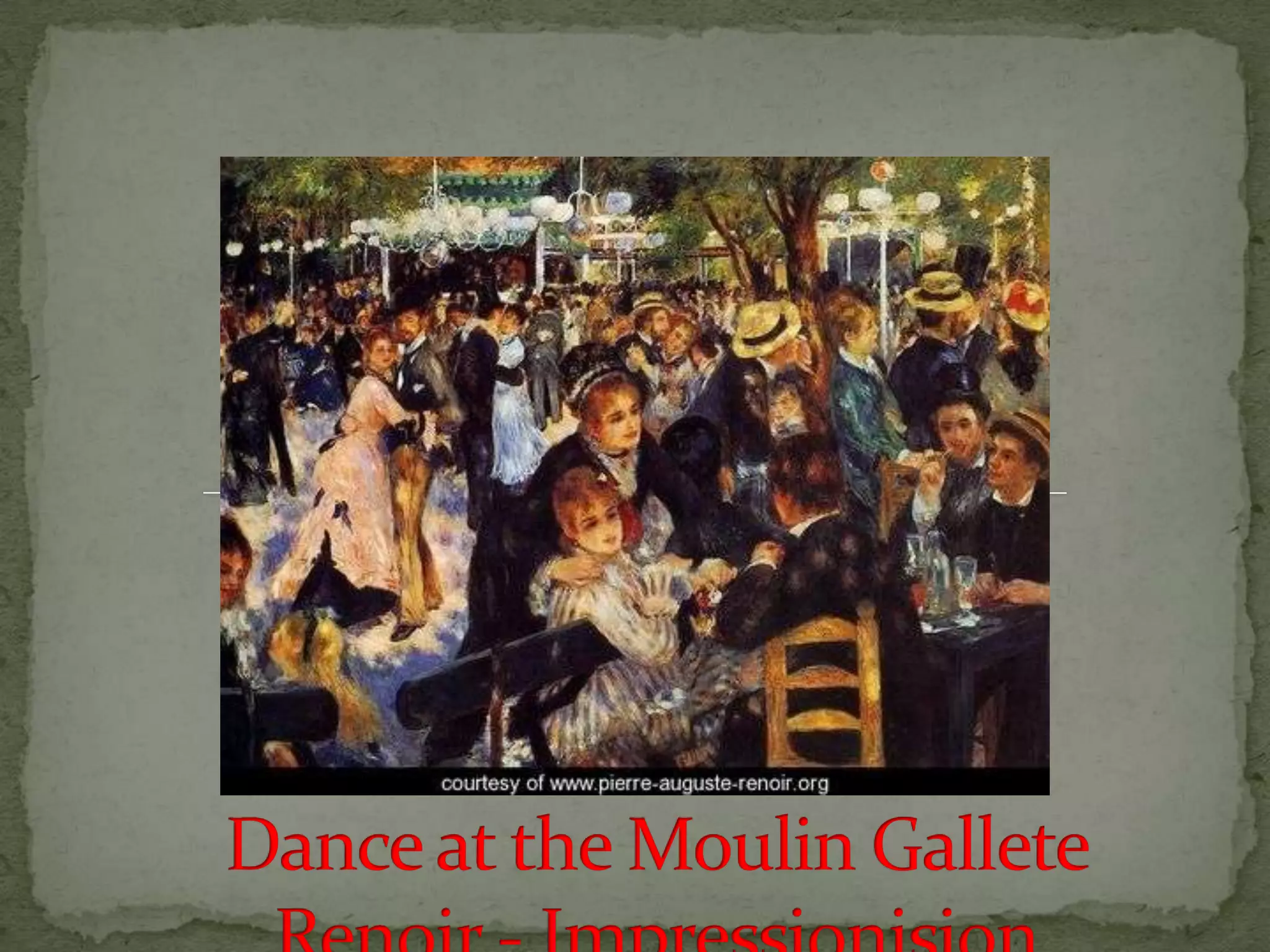 This document lists various famous artworks from the Impressionist and Post-Impressionist eras. It includes paintings such as Renoir's Dance at the Moulin Gallete and Luncheon of the Boating Party, Monet's haystacks and Jardin a saint addrese, Van Gogh's Starry Night and Night Café, Manet's Luncheon on the Grass and portrait of Emile Zola, as well as works by Degas, Cezanne, Rodin, Seurat, Whistler, and Gauguin that showcase styles ranging from Impressionism to Symbolism.