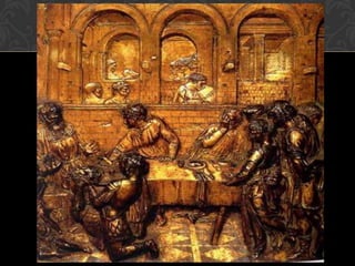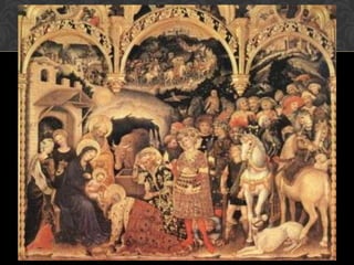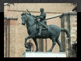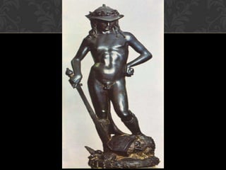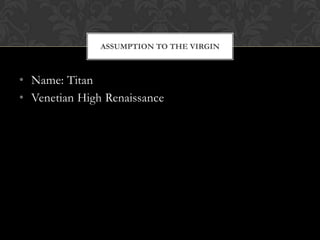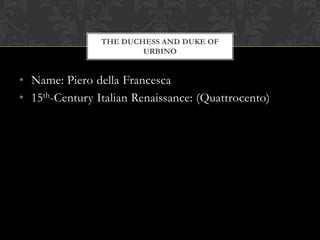 The document provides information on 57 artworks from various periods including the Proto-Renaissance, 15th century Northern and Italian Renaissance, High Renaissance, and International Gothic. It lists the artist, title, date, and movement for each work. The works are by artists such as Giotto, Donatello, Van Eyck, Da Vinci, Michelangelo, and others. It covers a wide range of mediums and subject matters.