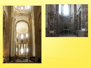 The document provides an overview of art in the Middle Ages, beginning with Late Antique art from the Roman era characterized by simple, streamlined designs that emphasized religious aspects over proportions and details. Byzantine art that followed was heavily influenced by Greek, Eastern, and Persian traditions and featured iconic representations of figures like the Virgin Mary. Architectural influences included domes, marble, and sculpted capitals. Romanesque art from 1000-1300 AD featured rounded arches, stone vaults, thick walls, and exterior relief sculptures in cathedrals and churches. Gothic art that followed was characterized mainly by architecture using mathematical harmony and light through pointed arches and stained glass in great cathedrals like Notre Dame of Paris and Reims Cathedral