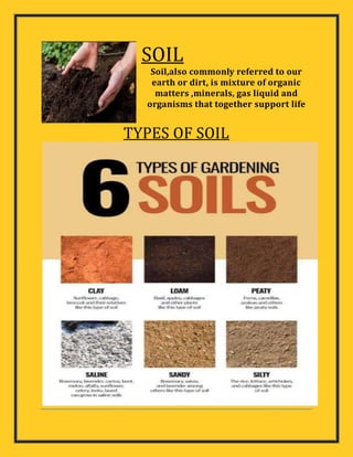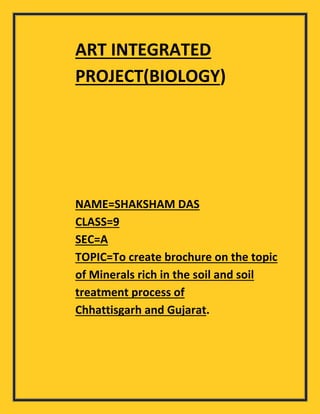 The document discusses the creation of a brochure on minerals rich in the soil and soil treatment processes in Chhattisgarh and Gujarat. It explains types of soil, including primary and secondary minerals, their uses in agriculture, and specific soil treatment methods in both regions. Key soil types and minerals from each state are also highlighted.