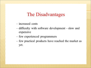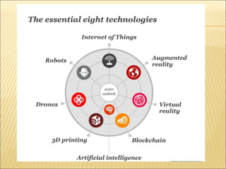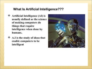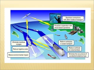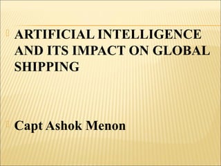 The document discusses artificial intelligence and its impact on global shipping. It defines AI and notes its advantages like reducing errors and making decisions without human emotions. Disadvantages include high costs, potential job losses, and an inability think creatively. The use of AI in shipping is described as limitless, with examples given of various companies applying AI to improve operations, predict weather, and make shipping safer and more efficient through technologies like remote container management and self-navigating ships. The rise of technologies like the Internet of Things, augmented reality, virtual reality, and mixed reality are also discussed in relation to transforming the shipping industry.