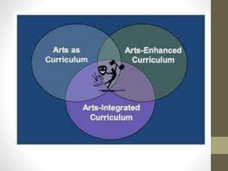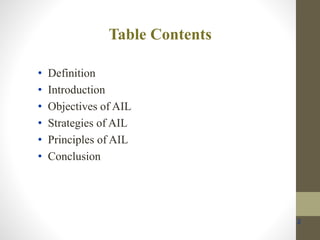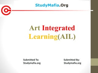 This document discusses Art Integrated Learning (AIL), which uses art as a medium for teaching other subjects. It defines AIL and outlines its objectives, strategies, and principles. The objectives are to make learning joyful and help students express themselves creatively while building connections between concepts. The strategies include capacity building, activity planning, time management, and resource planning. The principles are perception, practice, perseverance, patience, and passion. The conclusion states that AIL assessment helps evaluate both subject learning and socio-emotional development.