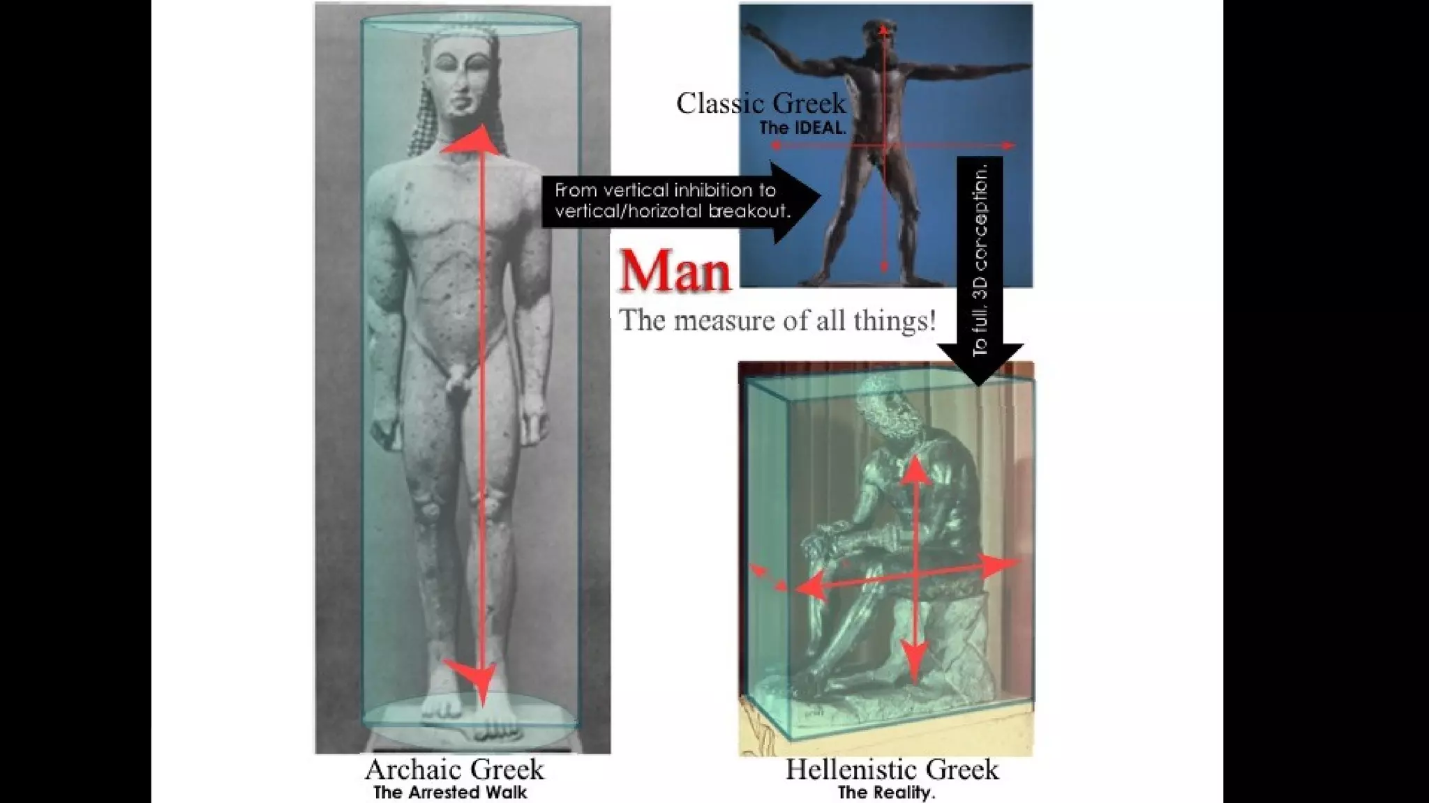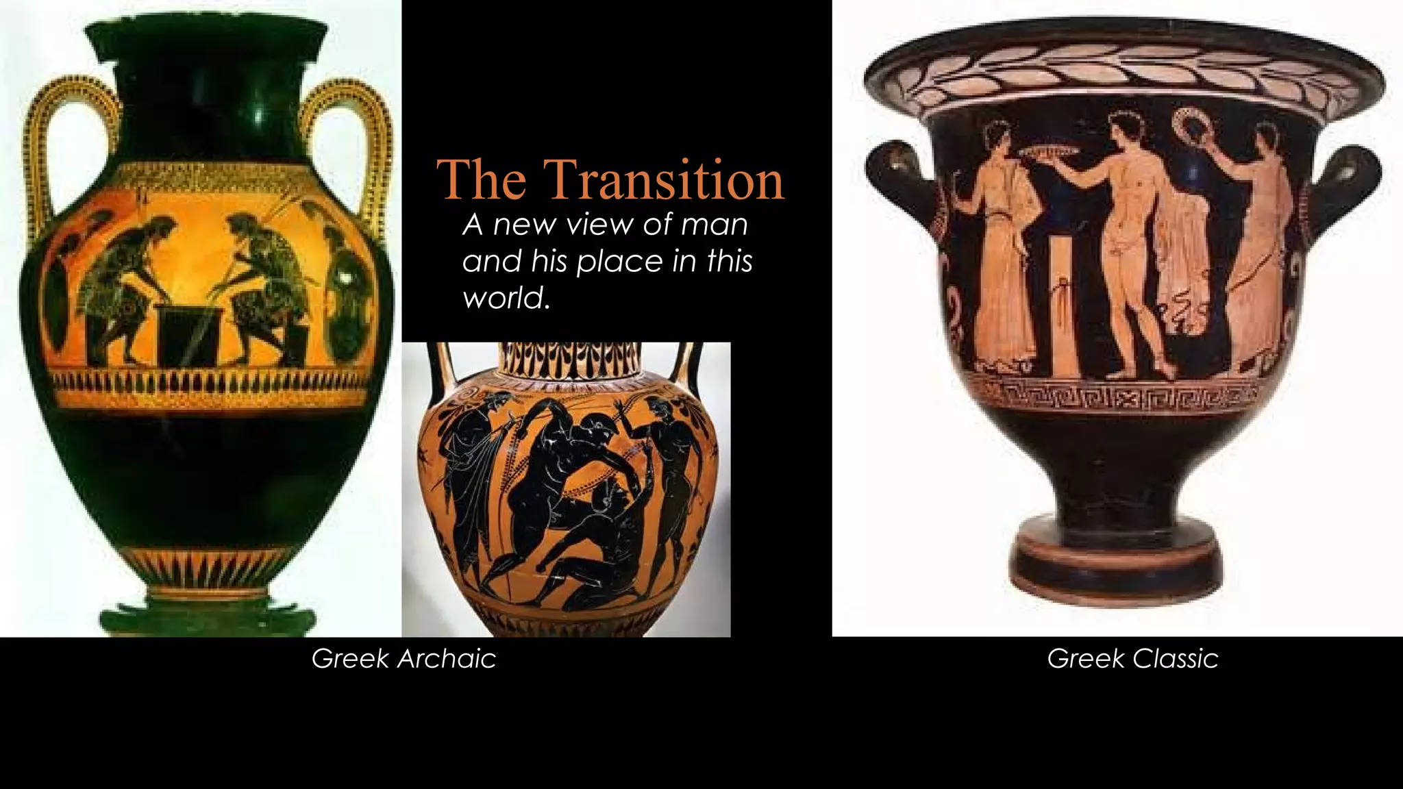 The document discusses the evolution of Greek art and culture from the archaic to the classic and Hellenistic periods, showcasing the transition towards humanism and the representation of the self. It highlights key artistic features such as anatomical awareness, idealism, and the significance of architecture, exemplified by structures like the Parthenon. Overall, it contrasts the idealized forms of classic Greek art with the realism seen in the Hellenistic period.