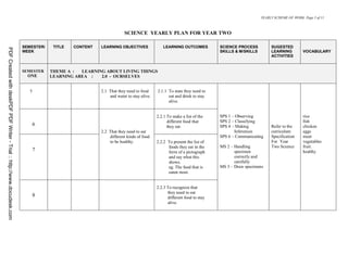 This document outlines the yearly plan for science instruction for Year Two students. It includes the semester, theme, learning area, title, content, learning objectives, learning outcomes, science process skills, suggested activities, and key vocabulary for each week of instruction. The plan covers two semesters and themes including learning about living things, ourselves, animals, plants, the world around us, and mixing things. Objectives focus on classifying and observing living and non-living things, the needs of humans and other animals, the life cycles of plants, properties of materials, and experiments with dissolving substances.