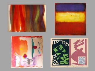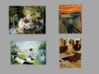 The document discusses different art movements through history and provides examples of artists and artworks within each movement. It defines an art movement as a style or tendency in art followed by a group of artists over a defined period of time with common goals or philosophies. The document then provides examples of Impressionism, Post-Impressionism, Fauvism, Cubism, German Expressionism, Surrealism, Abstract Expressionism, Pop Art, Geometric Abstraction, Minimalism, Photo-Realism, and Color Field painting, listing influential artists and their representative works within each movement. It poses questions about the visual elements, themes, and historical contexts to consider in analyzing art movements.