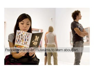 The document discusses creating an iPhone application to enhance visitors' art museum experience by helping them learn about and appreciate the art in a more personal and meaningful way. The app aims to help adult visitors with a basic interest in art understand art vocabulary, recognize design elements, discuss works in historical context, and identify masterworks and styles, in order to make the most of their time viewing art and better remember the details of what they've seen. It seeks to balance learning about art with actually looking at art.