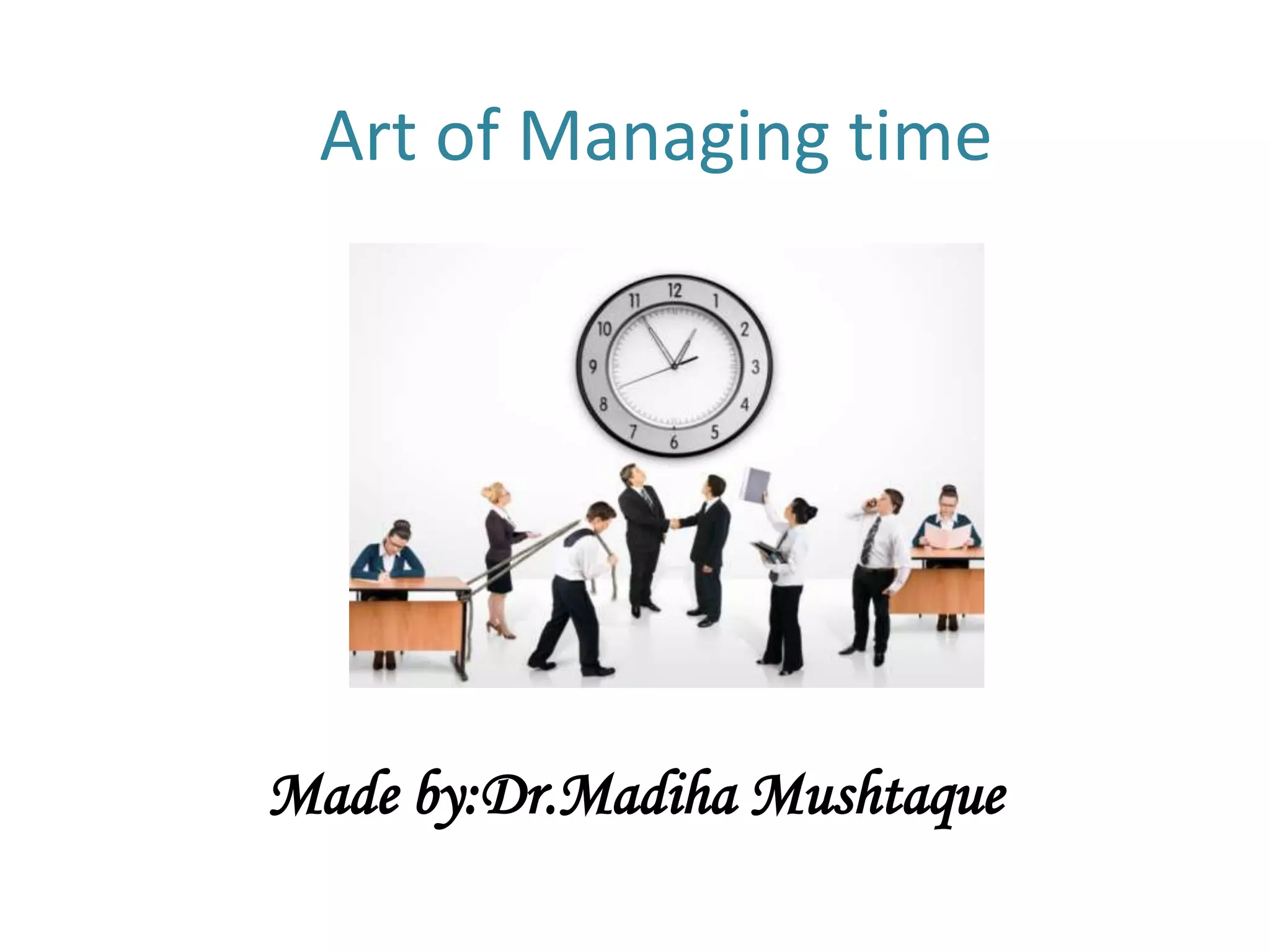 The document discusses time management strategies and common time wasters. It defines time management as the control an individual can exercise over events. Good time management can prevent stress, achieve balance, and increase productivity by making progress towards goals. Common time wasters include phone interruptions, poor planning, procrastination, and clutter. The document recommends setting SMART goals, prioritizing tasks, using to-do lists, saying no, being flexible, focusing on tasks, and using waiting time productively. It emphasizes starting important tasks immediately, reducing meeting time, planning ahead, and learning to say no.