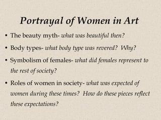 The document discusses the representation of women in art throughout history. It provides examples of artworks from various time periods and analyzes how they portray women and reflect societal expectations. The roles, body types, and symbolism of women are examined, as well as how few women worked as artists until modern times due to social and cultural barriers. Specific works by female artists like Berthe Morisot, Mary Cassatt, Frida Kahlo, Georgia O'Keeffe, and Annie Leibovitz are also mentioned.