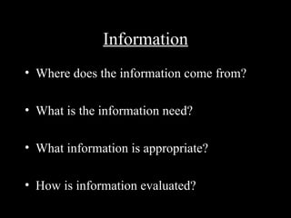 The document provides information on how to effectively research and find resources, discussing the types of information available, how to evaluate sources, and how to plan a research process that is multi-step and interdisciplinary in nature. It covers key concepts like the differences between primary and secondary sources, factual vs. analytical information, and objective vs. subjective perspectives. Catalogs, books, periodicals, databases, and evaluating online sources are also discussed as important tools and considerations for conducting thorough research.