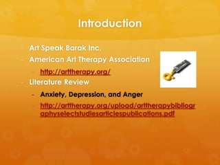 The proposal outlines an 8-week art therapy group for middle and high school students experiencing trauma, anxiety, depression, or anger. The group uses various art mediums and activities to help participants express and process emotions, build life skills, and develop a collaborative mural. Each session incorporates check-ins, art projects tied to therapeutic themes, and group discussions to provide insight and coping strategies. Post-tests are administered to assess changes in participants' emotional states.